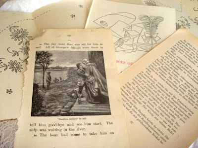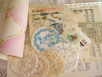 Included are: handmade lace doilies, vintage wallpaper, sheet music, antique book pages, antique greeting cards, train tickets, paper heart doily, "new" antique liquor label, linen transfer, and more. (I will probably throw in a few additional surprises as I come across them!)