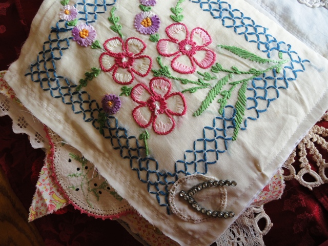 On the facing page, a linen pocket made from a napkin, onto which I'd sewn a gorgeous piece of antique tulle lace with a floral motif embroidered onto it.