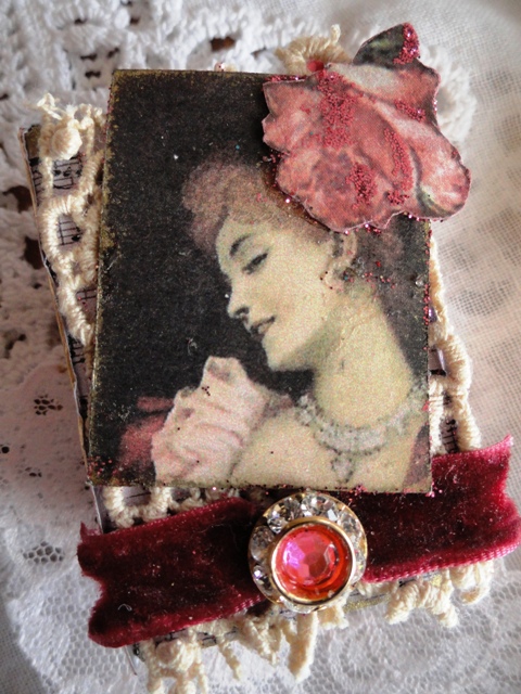 For this swap, we had to decorate a TINY matchbox and fill it with 3 TINY ATC's (Artist Trading Cards.) So, for this swap then, the size was the challenge! Here's the box I decorated for Linda. I used vintage crochet trim, and vintage millinery flowers onto which I glued rhinestones that had fallen out of vintage jewel pieces!